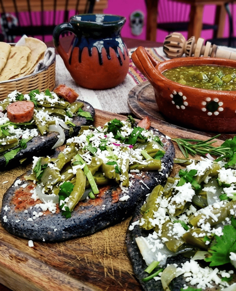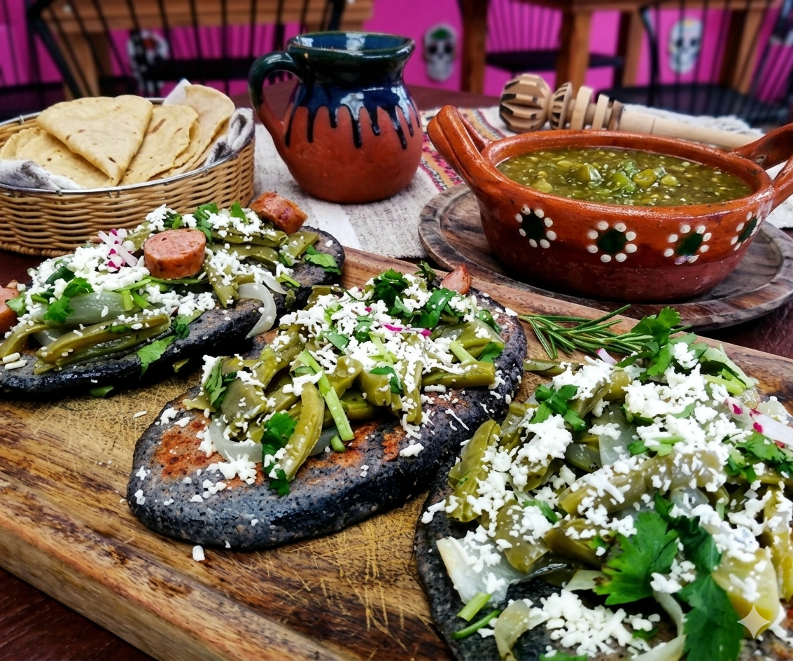 Tortillas de maíz (blanco o azul ) alargadas y gruesas rellenas de, requesón, espinaca, frijol o haba, cocidas en el comal hasta dorar perfectamente.