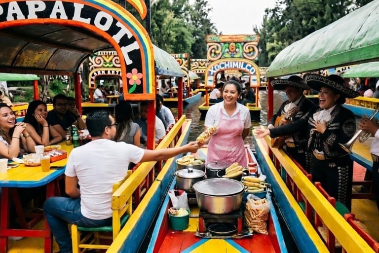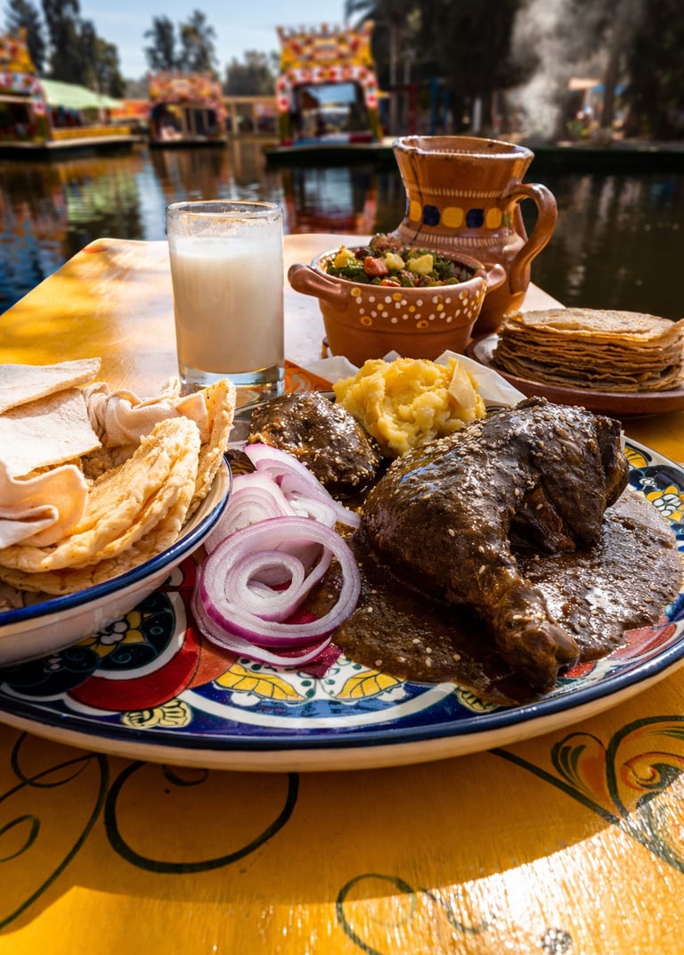 Imagina esto: estás en una trajinera que se desliza suavemente por los canales. El sonido del agua es acompañado por las leyendas que tu guía local narra. En la mesa, humeantes tamales envueltos en hoja de plátano, el aroma del mole que se mezcla con el aire fresco del Anáhuac, y el sabor dulce del pulque curado con frutas que acabas de ver crecer en las chinampas.